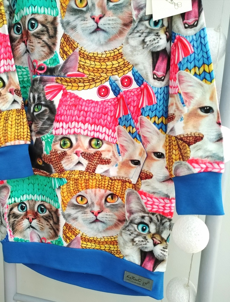 Przepiękna dziecięca sukienka dresowa z kapturek typu kangurka, z dużą kieszenią na przodzie, uszyta z wysokogatunkowej bawełny premium, w piękny print kotków, nadruk na dzianinie wykonany jest metodą cyfrową co zapewnia najwyższą jakość nadruku, dodatkowo dzięki domieszce elastanu 6-8% jest wygodna, elastyczna, idealna na co dzień, jak i na wyjątkowe okazje.