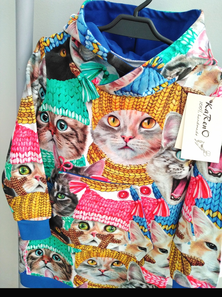 Sukieneczka dresowa dziewczęca z kapturem typu kangurka z dużą kieszenią na przodzie w piękny wzór kotków w czapkach i szalikach w połączeniu z dzianiną w kolorze chabrowym