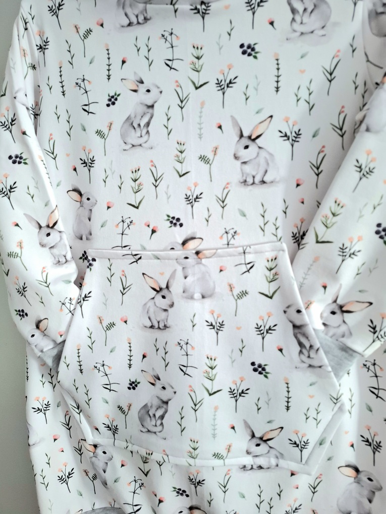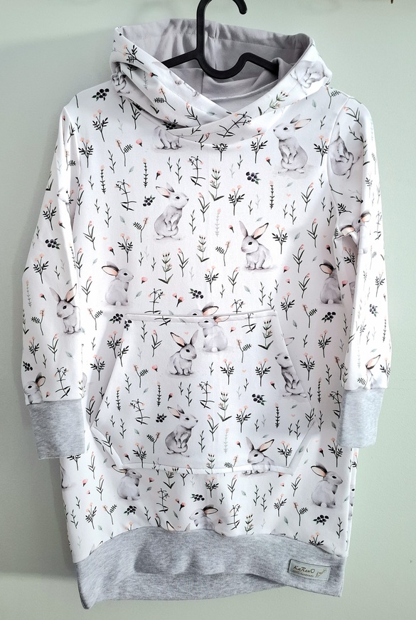 Sukieneczka dresowa dziewczęca z kapturem typu kangurka z dużą kieszenią na przodzie w piękny wzór króliczków w połączeniu z dzianiną w kolorze szarym.