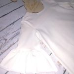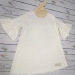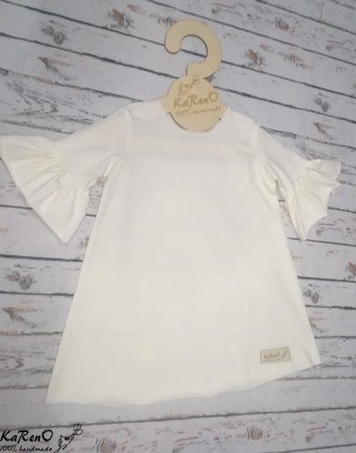 Modna sukieneczka dla dziewczynki w o fasonie trapezu z rękawkami ozdobionymi falbankami w kolorze śmietankowym.