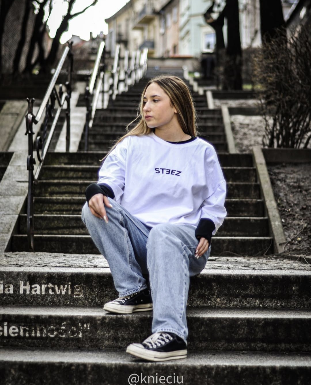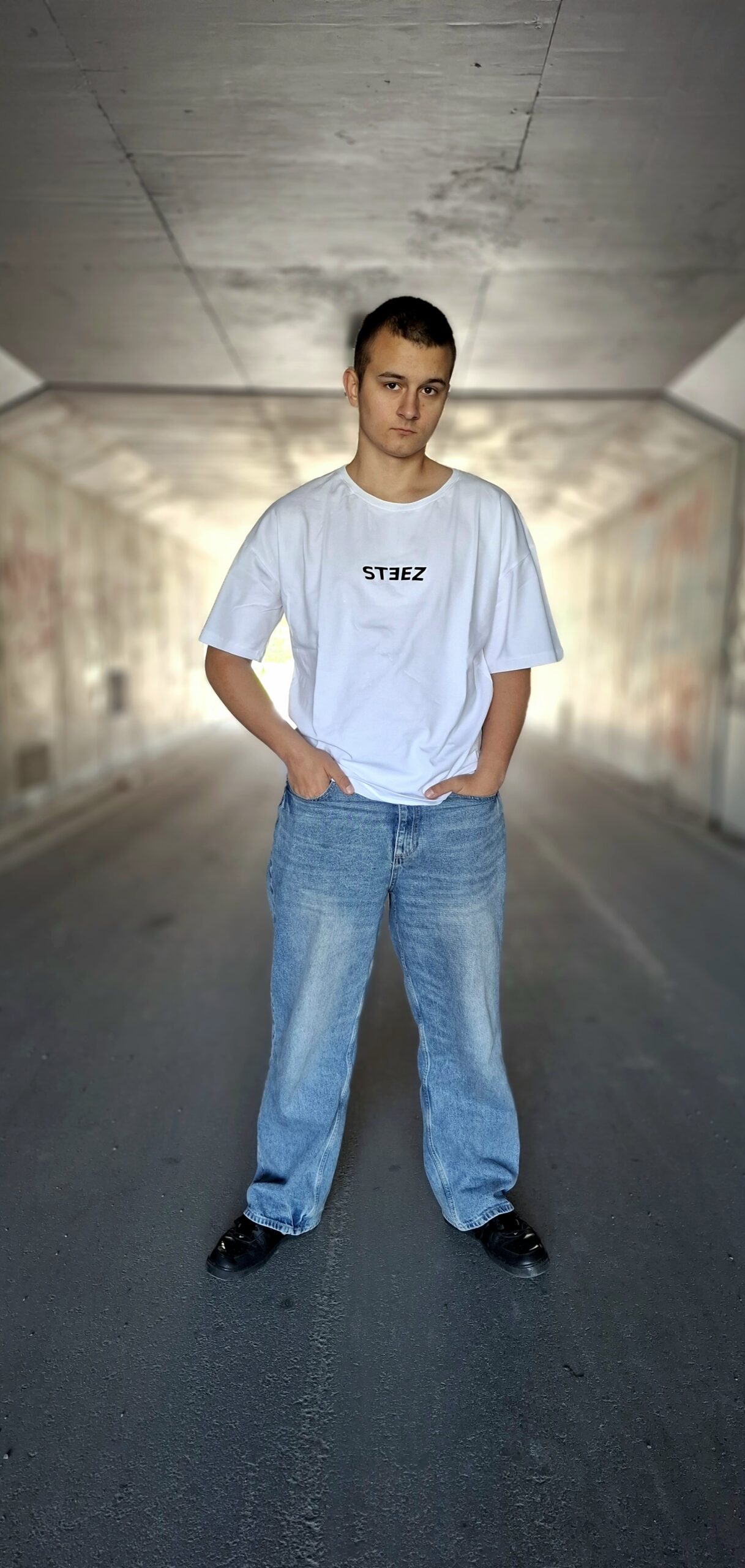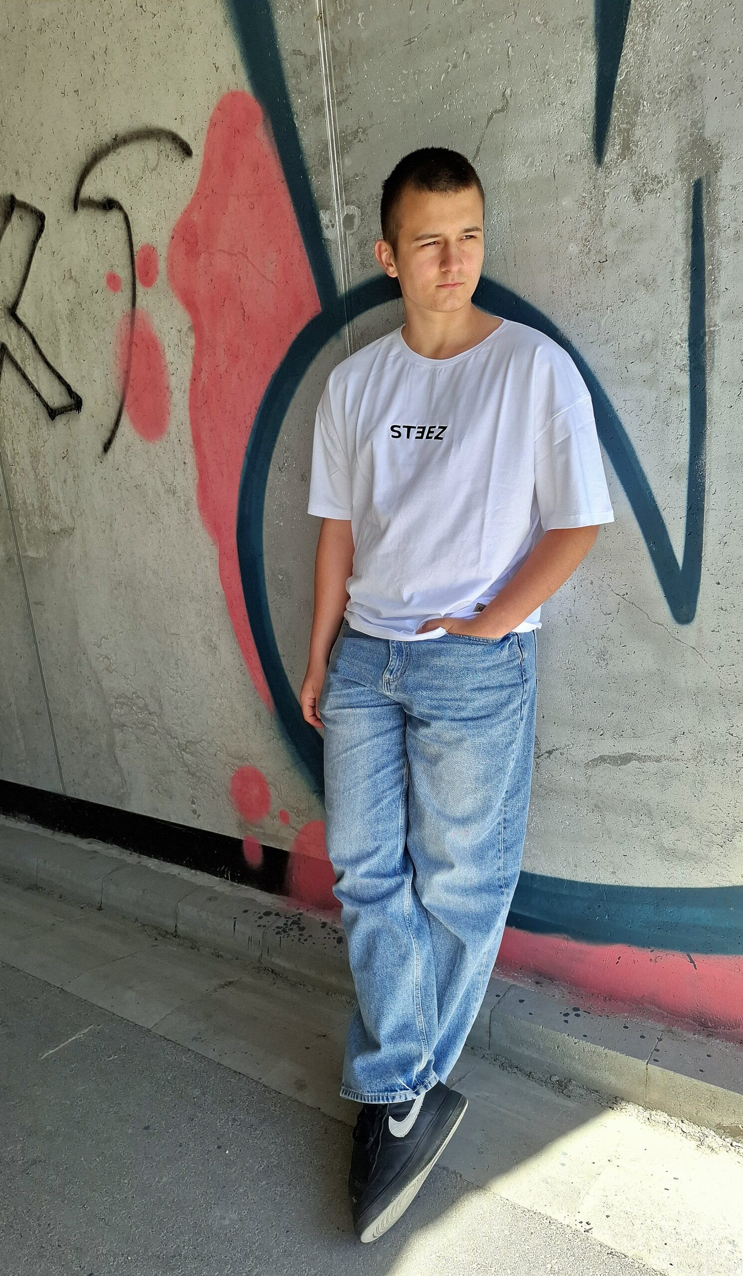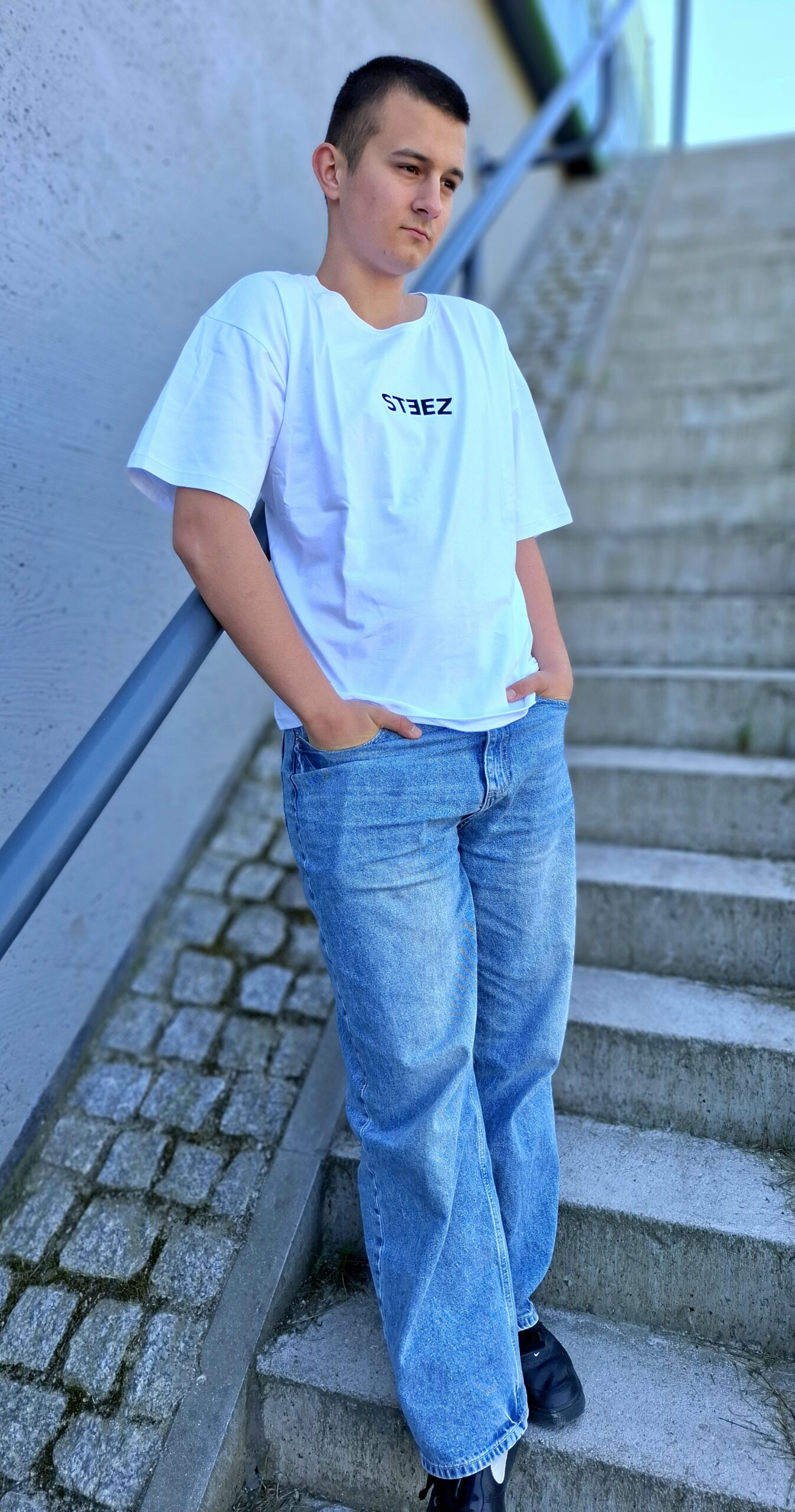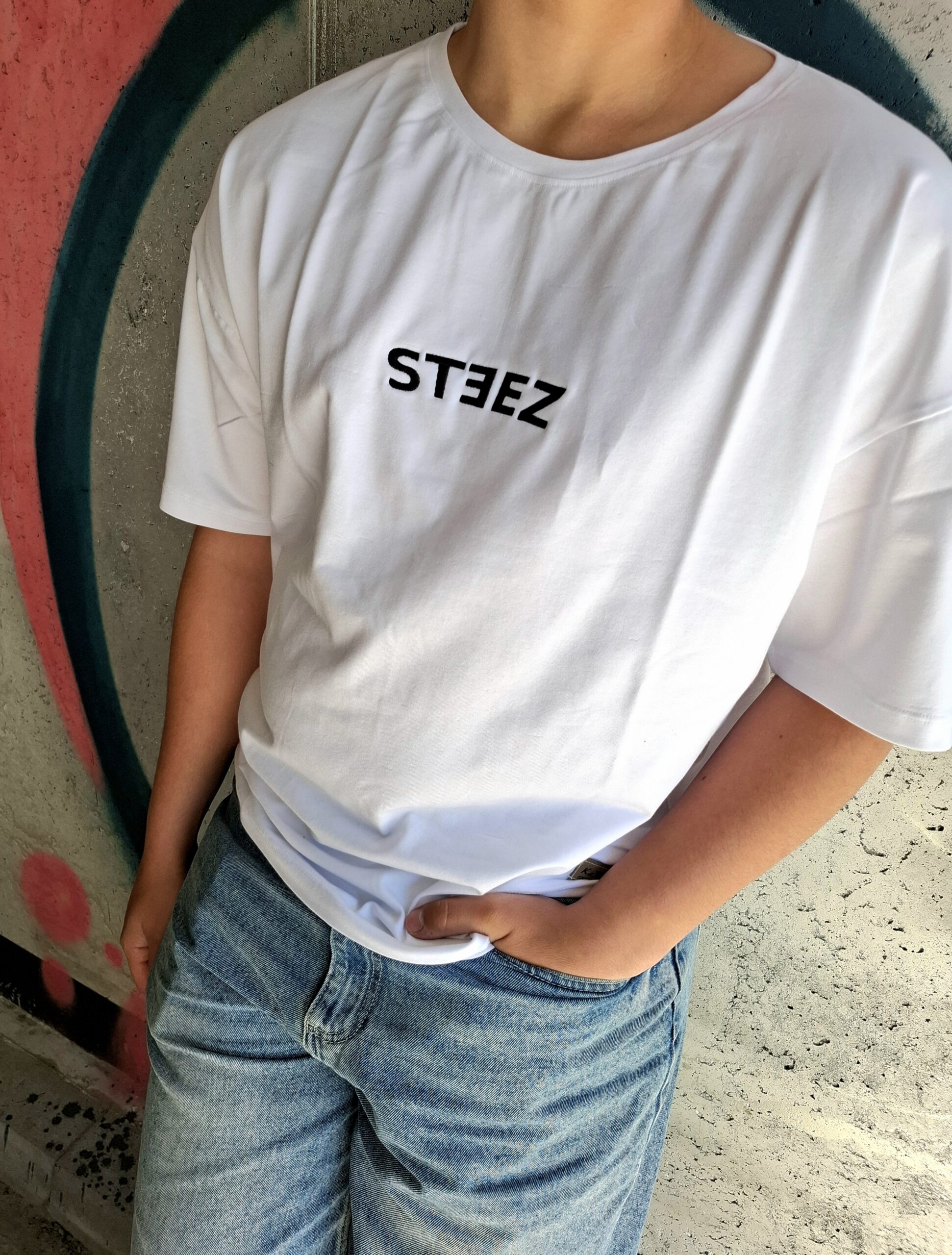 Na przodzie koszulki umieściliśmy subtelny, lecz wyrazisty haft „steez”, który podkreśla streetwearowy charakter produktu.
