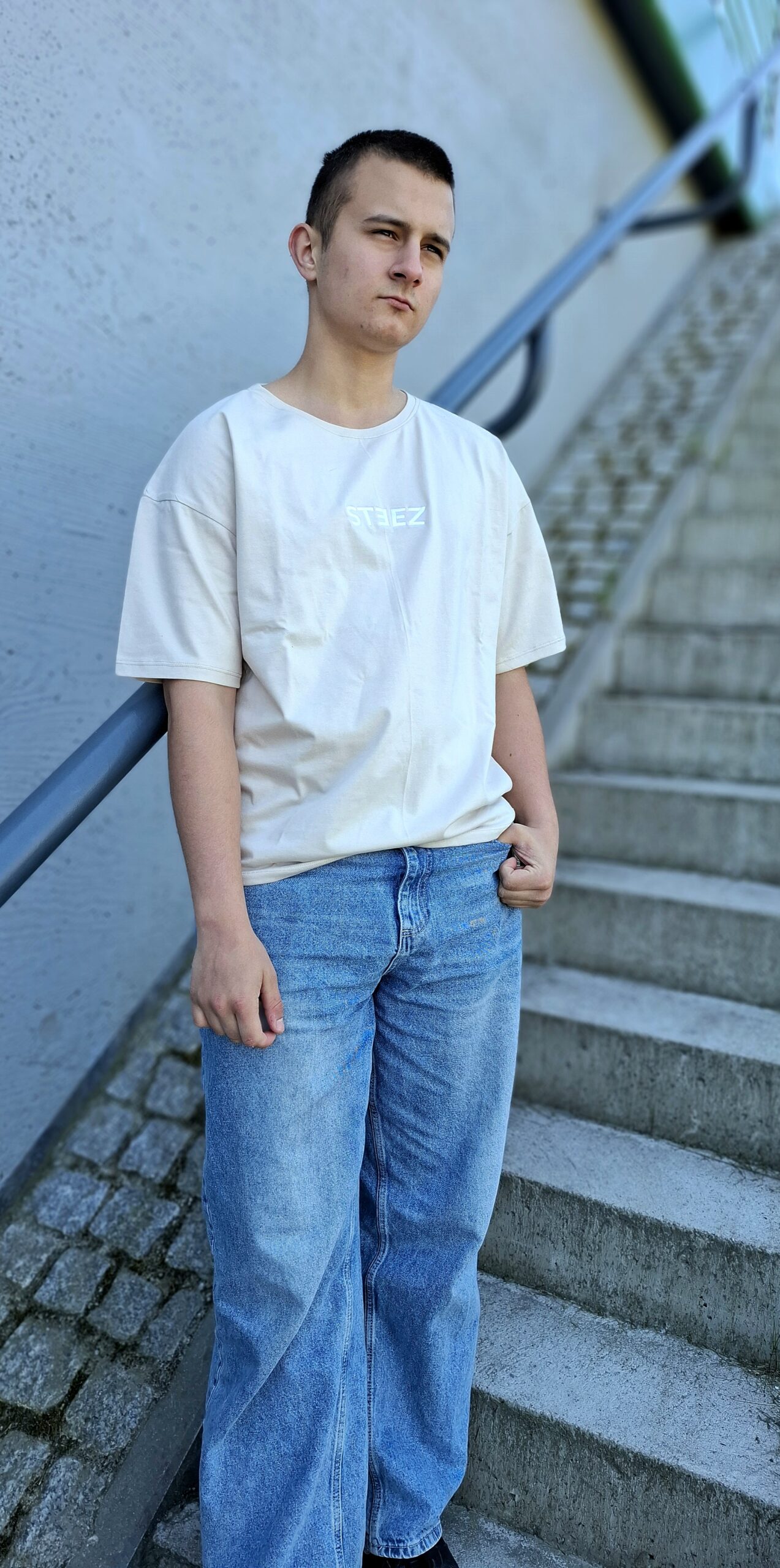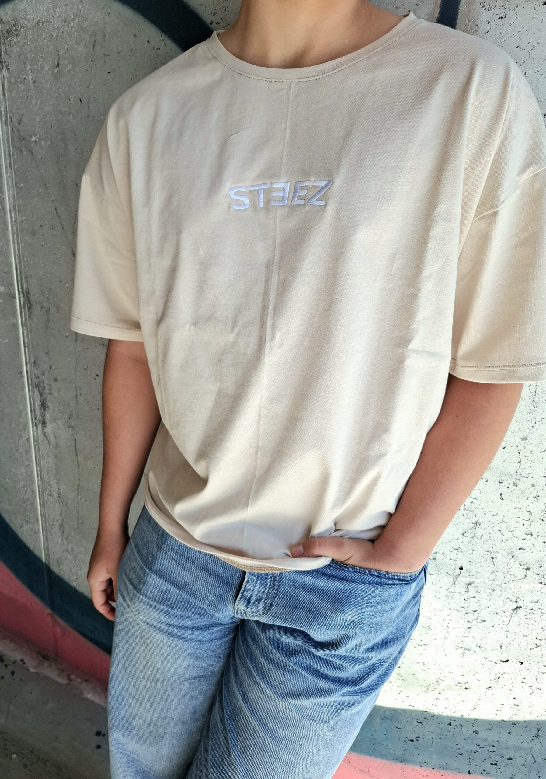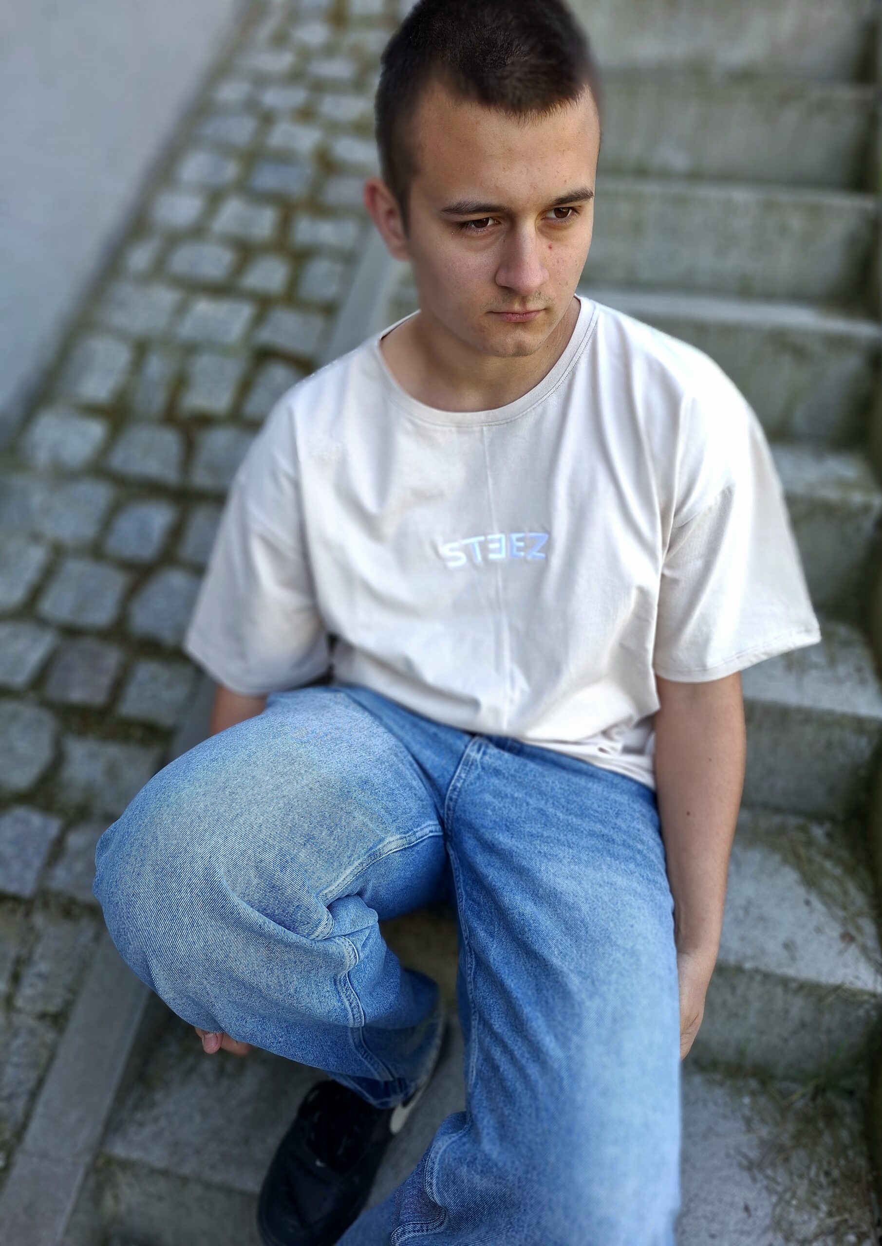 Na przodzie koszulki umieściliśmy subtelny, lecz wyrazisty haft „steez”, który podkreśla streetwearowy charakter produktu.