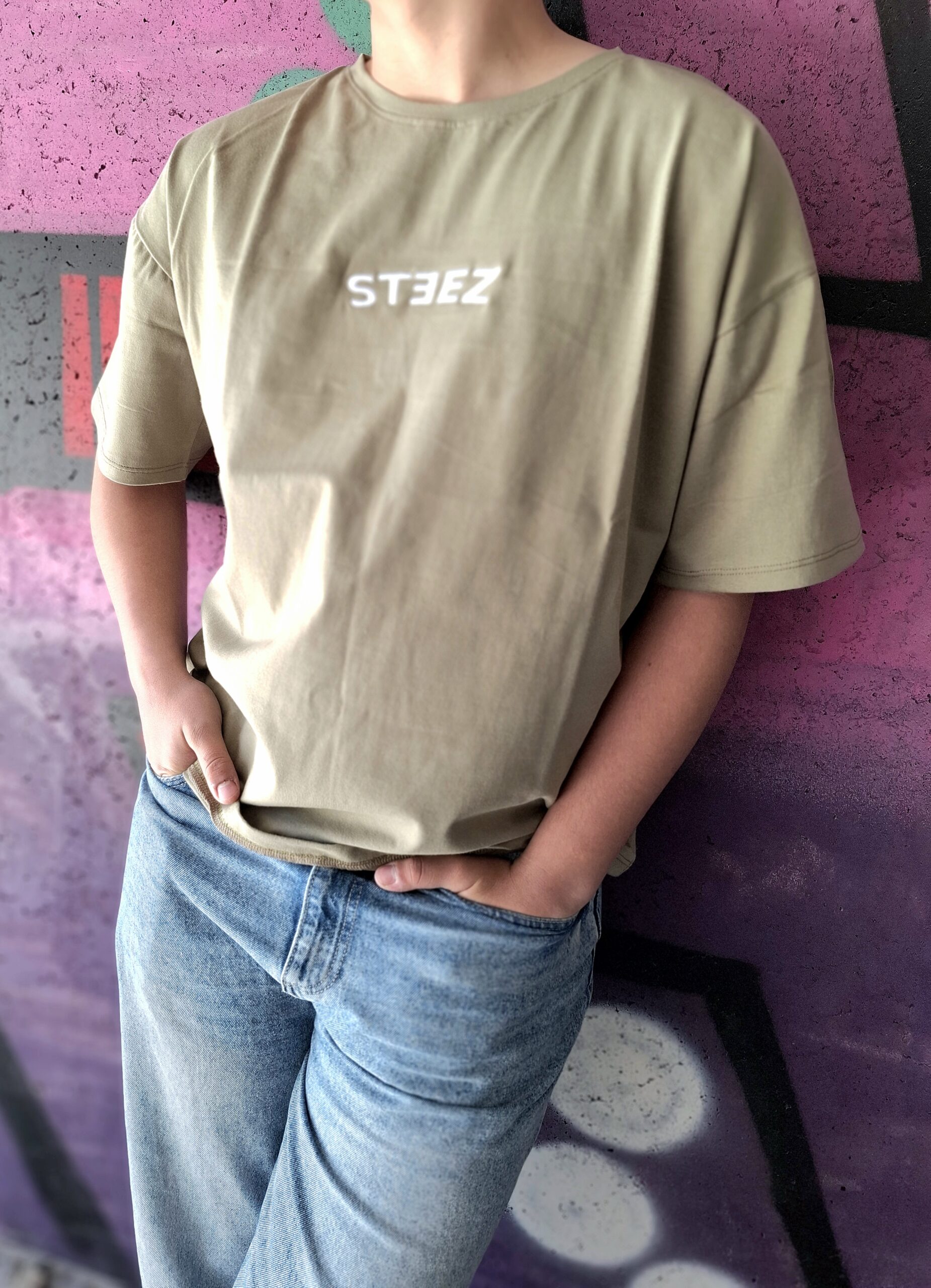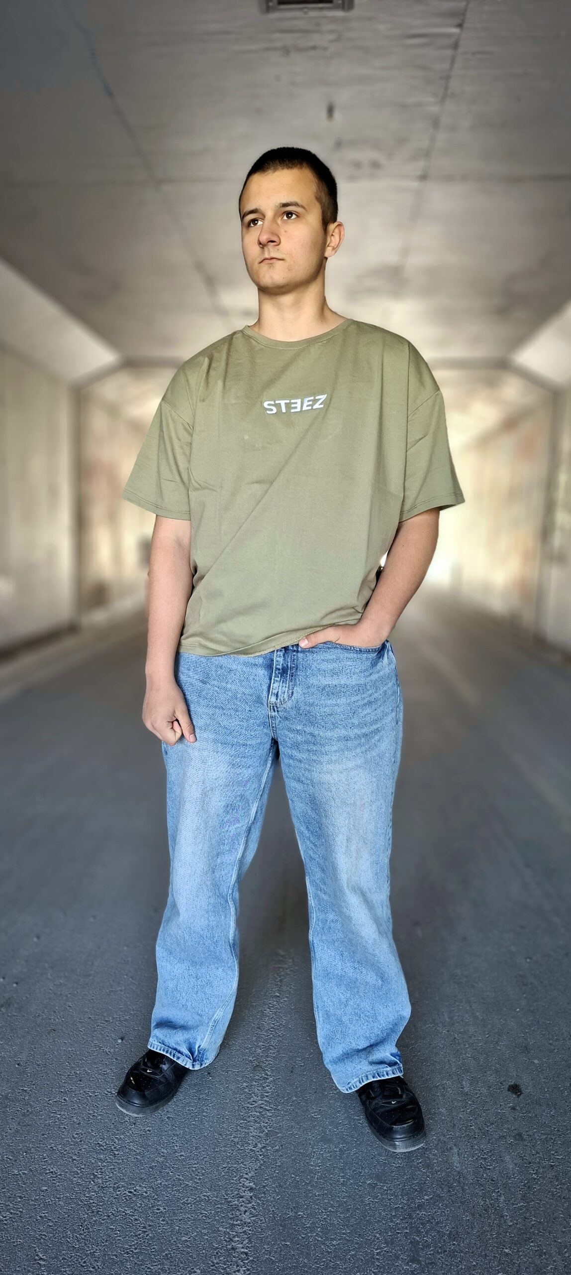 Na przodzie koszulki umieściliśmy subtelny, lecz wyrazisty haft „steez”, który podkreśla streetwearowy charakter produktu.