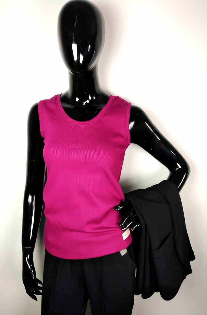 Klasyczny top damski bez rękawów, uszyty z dzianiny bawełnianej premium prążek, idealny pod wszelkiego rodzaju marynarki, kardigany itp. Elastyczny, rozciągliwy. Kolor topu to piękny róż biskupi.