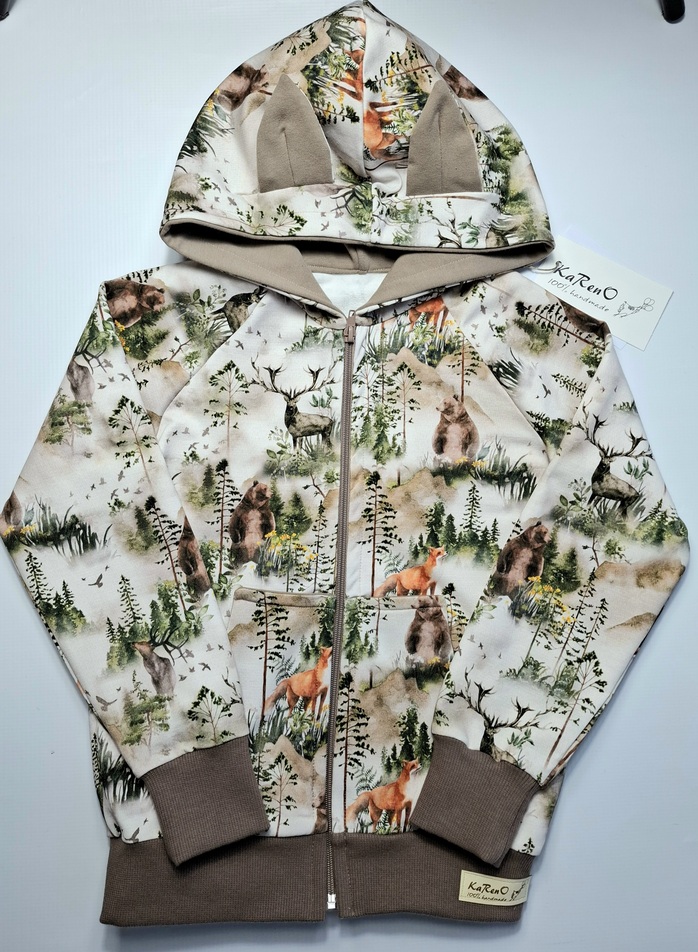 Bluza z kapturem na zamek zwierzęta w lesie beż